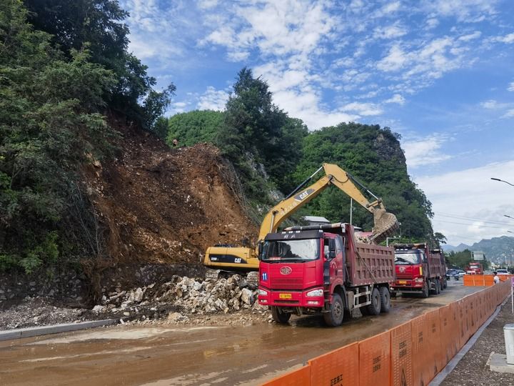 8月6日早7點10分左右,下解放村山上的巨石終于緩緩滑落到路面上。危險解除了,壓在干部群眾心頭的“巨石”,也終于落了地!