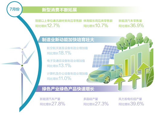 綠色產(chǎn)業(yè)綠色產(chǎn)品快速增長。7月份,新能源汽車產(chǎn)量同比增長27.8%,多晶硅產(chǎn)量同比增長27.3%、風(fēng)力發(fā)電機(jī)組產(chǎn)量同比增長39.6%。