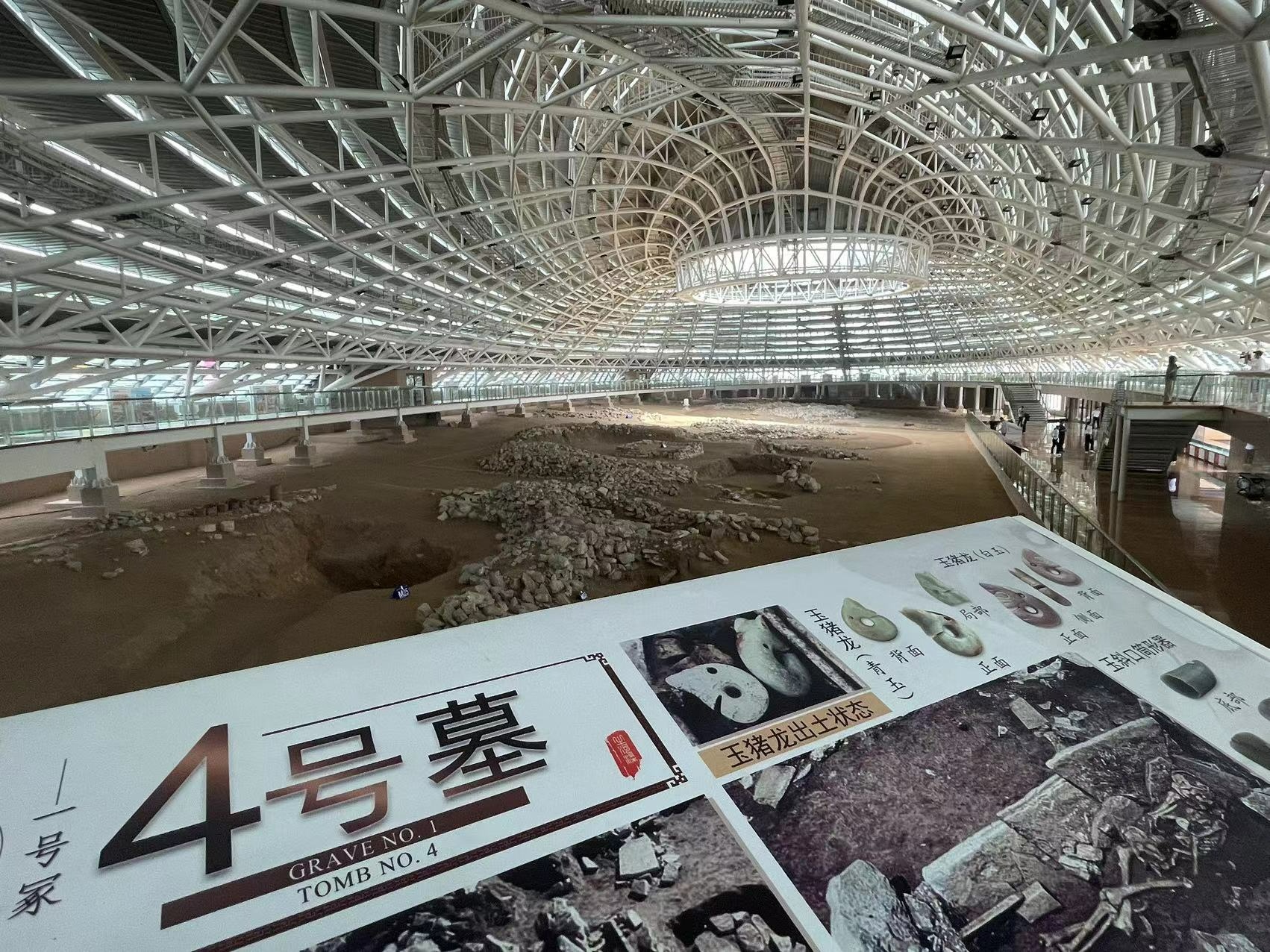 該博物館副館長(zhǎng)蓋麗艷介紹,1984年8月初,遼寧省考古工作者在牛河梁遺址第二地點(diǎn)的1號(hào)冢4號(hào)墓,發(fā)掘出兩件精美玉器。這兩枚玉器形態(tài)肥碩可愛(ài),是典型的豬頭蛇身,被稱為“玉豬龍”。由于它形似玉玨,后來(lái)被正式命名為“玉玨形龍”。因?yàn)橛颀埓蚩?,置于逝者胸前,因此專家判斷,玉豬龍可能是當(dāng)時(shí)先民的族徽。此外,玉鳳也出現(xiàn)在逝者的腦后。