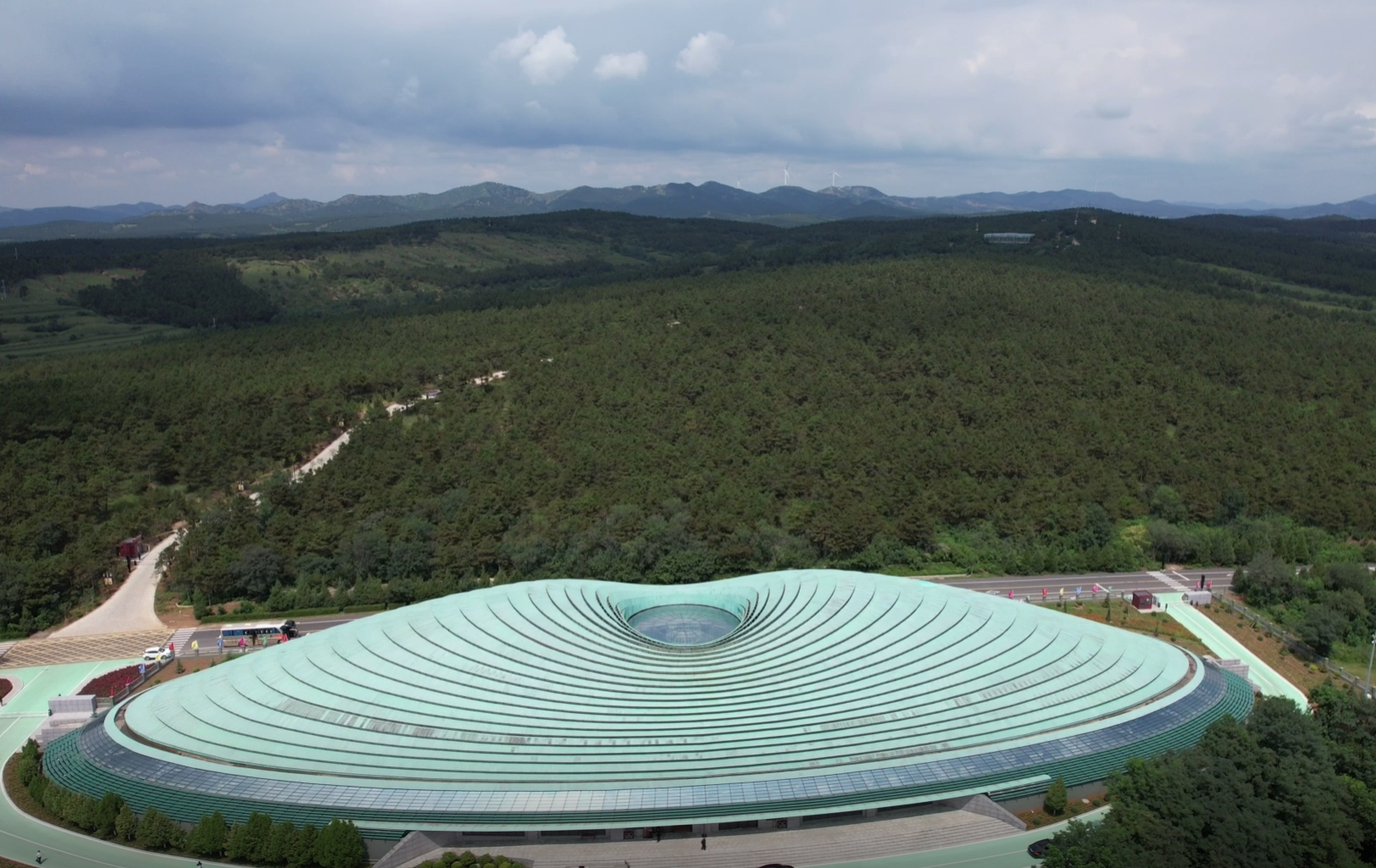 積石冢展覽館鳥(niǎo)瞰,遠(yuǎn)處建筑為牛河梁女神廟展覽館(央廣網(wǎng)記者 李子平 攝)