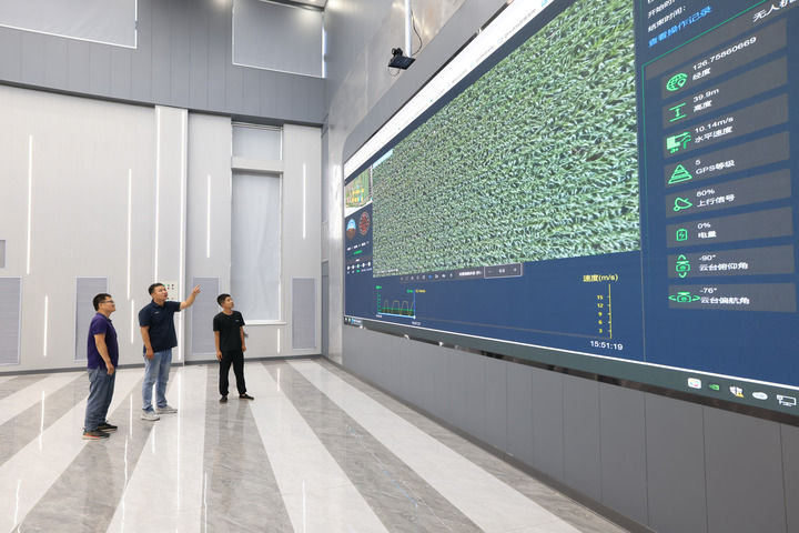 在黑龍江北大荒集團趙光農(nóng)場有限公司科技服務(wù)中心,農(nóng)業(yè)科技人員通過田間物聯(lián)網(wǎng)系統(tǒng)在數(shù)字農(nóng)業(yè)指揮大廳實時觀看智能無人機回傳的視頻,及時查看田間作物長勢情況(2024年7月22日攝)。新華社發(fā)(錢泊羽攝)