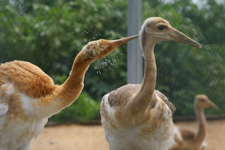 丹頂鶴雛鳥在遼寧盤錦市林業(yè)和濕地保護服務(wù)中心鶴類繁育保護站內(nèi)嬉戲(2023年8月3日攝)。新華社記者 陳為 攝