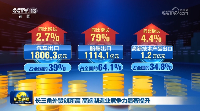 海關(guān)最新數(shù)據(jù)顯示,今年前7個(gè)月,長三角地區(qū)進(jìn)出口規(guī)模創(chuàng)歷史新高,汽車、船舶、數(shù)控機(jī)床等產(chǎn)品出口亮眼,長三角地區(qū)高端制造業(yè)國際競爭力加速提升。