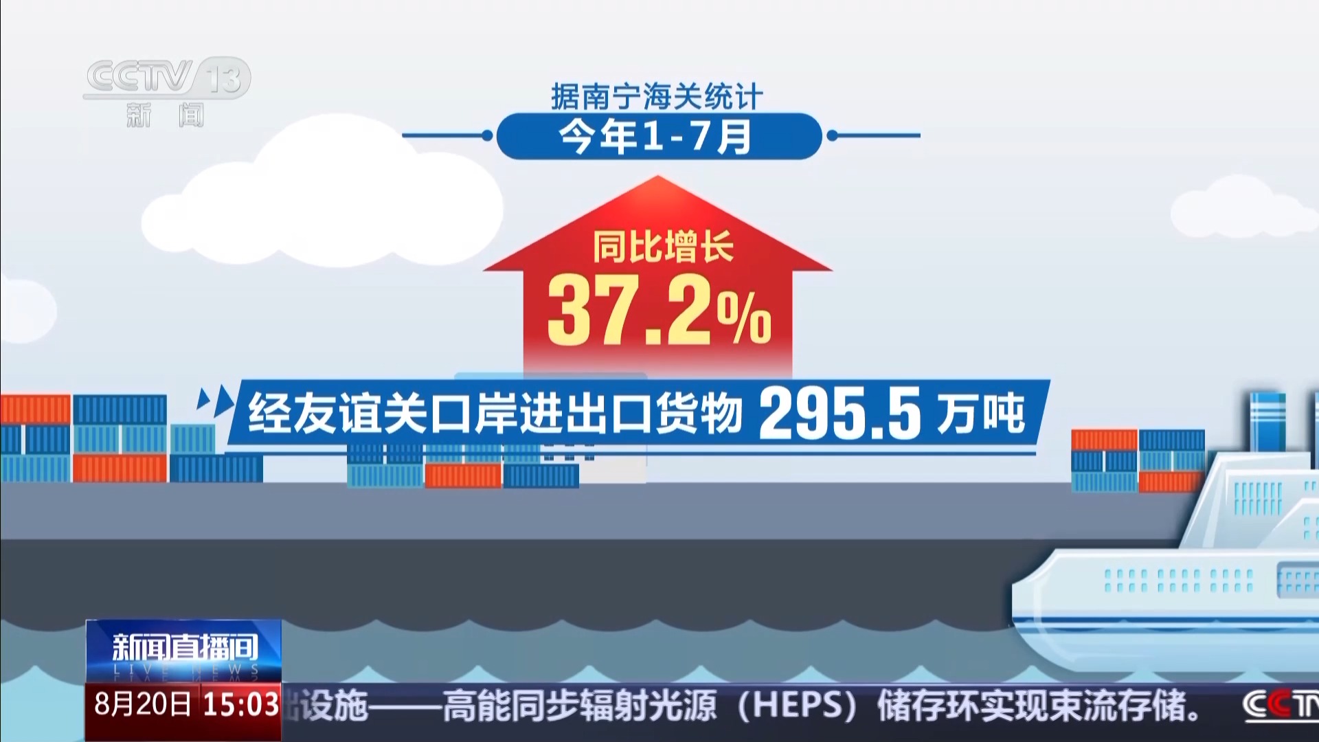 據(jù)南寧海關(guān)統(tǒng)計,1—7月,經(jīng)友誼關(guān)口岸進出口貨物295.5萬噸,同比增長37.2%。其中對越南2128.5億元,同比增長28%。進出境車輛27.3萬輛次,同比增長17.1%。