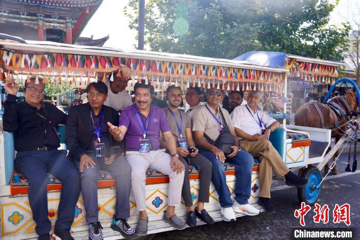 22日,巴基斯坦媒體人乘坐街區(qū)特色的電驅(qū)動馬車,參觀游覽民族風情街。陳欣怡 攝