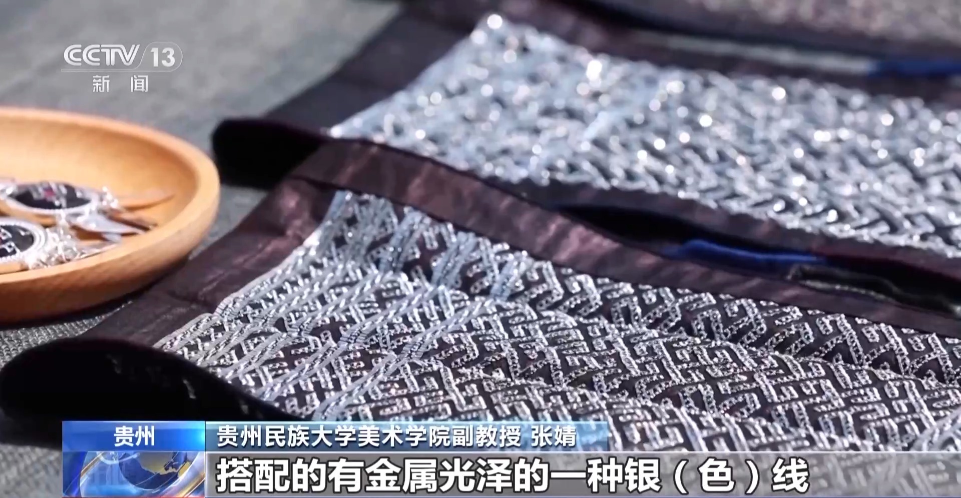 貴州民族大學美術學院副教授 張婧:錫繡會用到一些藏青色的底布、暗色系的絲線,搭配有金屬光澤的一種銀色線,以此形成強烈對比。對中國傳統(tǒng)刺繡、苗族刺繡來說,它的藝術風格都是具有自己鮮明特征的。