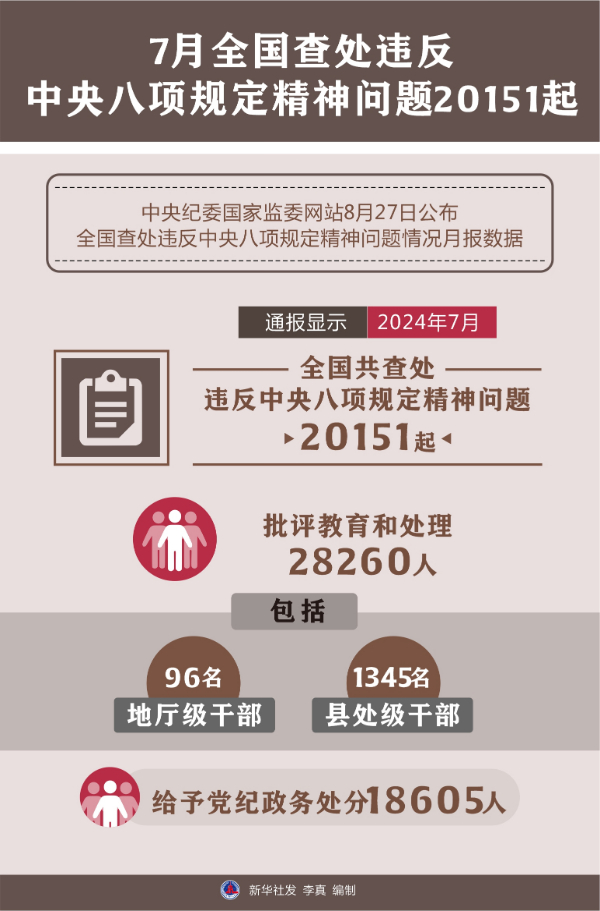 中央紀(jì)委國家監(jiān)委網(wǎng)站27日公布全國查處違反中央八項(xiàng)規(guī)定精神問題情況月報(bào)數(shù)據(jù)。通報(bào)顯示,今年7月,全國共查處違反中央八項(xiàng)規(guī)定精神問題20151起,批評教育和處理28260人(包括96名地廳級干部、1345名縣處級干部),給予黨紀(jì)政務(wù)處分18605人。