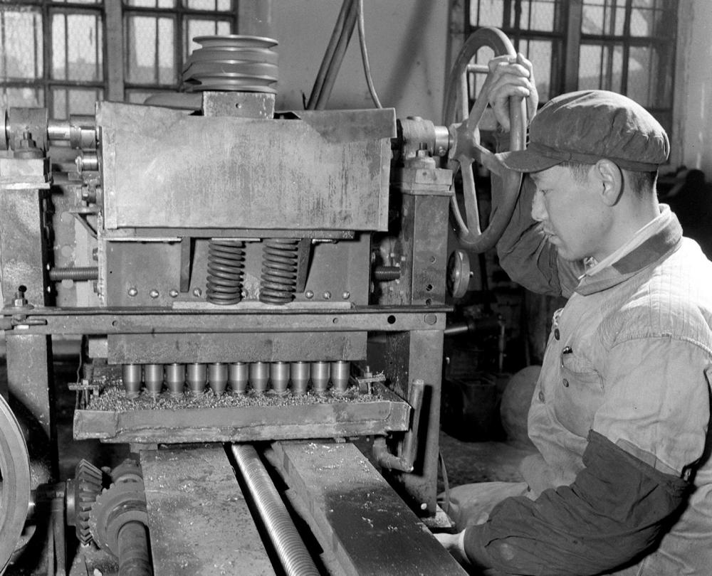 1958年2月12日,哈爾濱機(jī)聯(lián)機(jī)械廠四車間老工人宋振東(鉗工),經(jīng)過一月多的刻苦鉆研,創(chuàng)造出一臺多頭鉆床,它的生產(chǎn)效率比一般鉆床要提高效率11倍。新華社記者佟德印攝