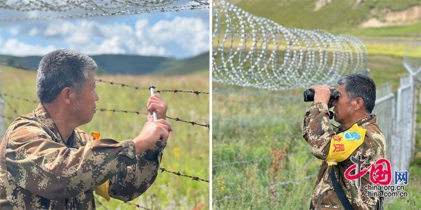巡邊時,王玉發(fā)拿著望遠(yuǎn)鏡眺望遠(yuǎn)方,看到松動的鐵絲網(wǎng),用鉗子和錐子加固。中國網(wǎng)記者 吳佳潼 攝