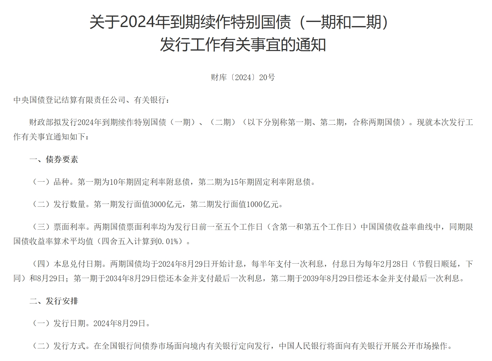 8月19日,財政部發(fā)布關于2024年到期續(xù)作特別國債發(fā)行工作有關事宜的通知。財政部擬發(fā)行2024年到期續(xù)作特別國債(一期)、(二期)。第一期為10年期固定利率附息債,第二期為15年期固定利率附息債。第一期發(fā)行面值3000億元,第二期發(fā)行面值1000億元。兩期國債票面利率均為發(fā)行日前一至五個工作日(含第一和第五個工作日)中國國債收益率曲線中,同期限國債收益率算術平均值(四舍五入計算到0.01%)。發(fā)行日期為2024年8月29日,在全國銀行間債券市場面向境內有關銀行定向發(fā)行,中國人民銀行將面向有關銀行開展公開市場操作。