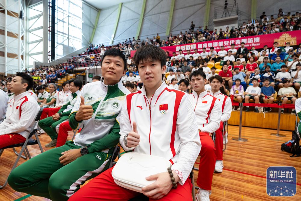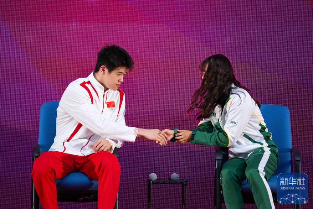 ↑9月1日,游泳運(yùn)動(dòng)員潘展樂(左)在活動(dòng)中與澳門運(yùn)動(dòng)員握手交流。