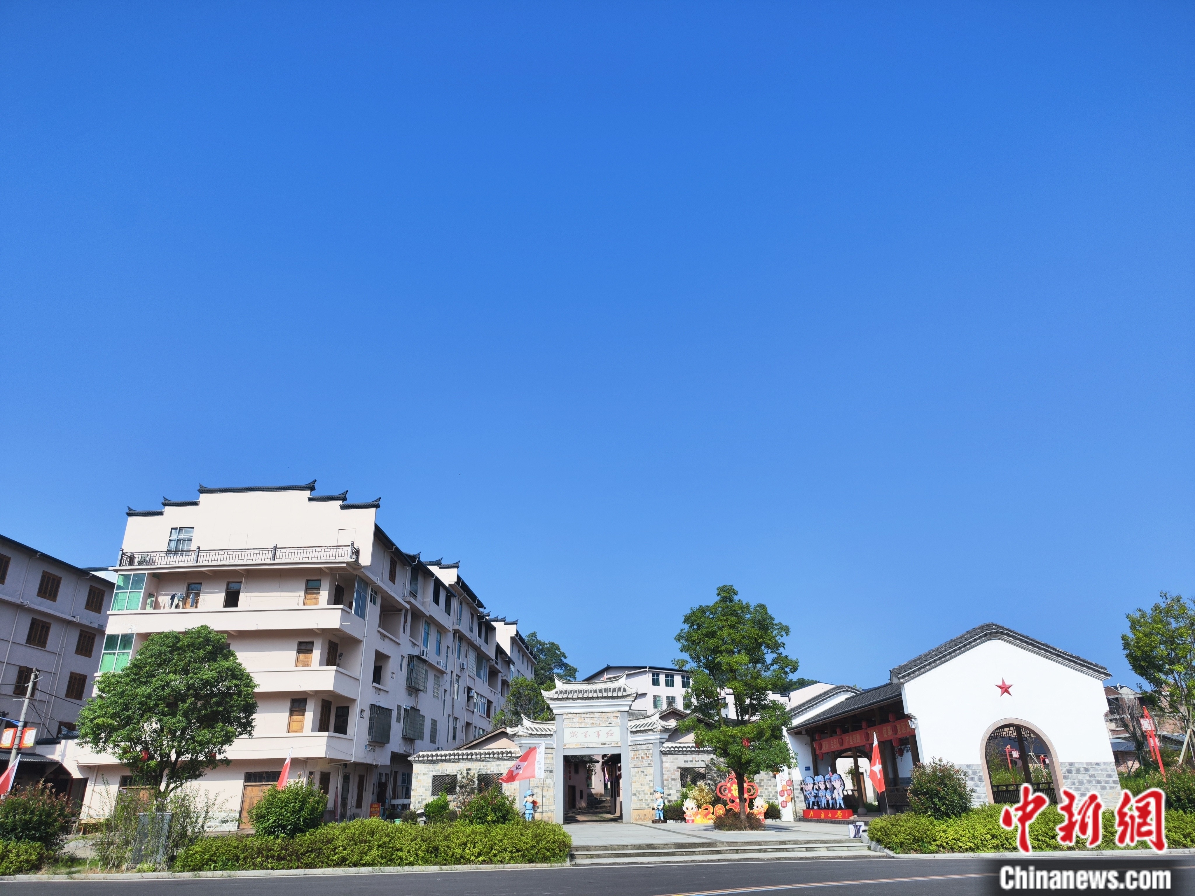 放眼望去,良田美池,碧樹繁花,阡陌交通,屋舍儼然,長(zhǎng)征主題壁畫、標(biāo)語隨處可見。而最引人注目的,還是那條長(zhǎng)達(dá)千米的“紅軍街”。