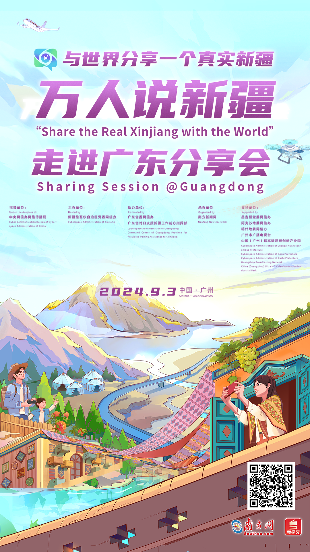 在交流互鑒中把新疆溫柔地說與全世界,在新粵兩地合作中感悟跨“粵”千里的援疆故事?!叭f人說新疆”走進廣東分享會將于9月2日至3日在廣州舉行。此次活動由新疆維吾爾自治區(qū)黨委網信辦主辦,廣東省委網信辦、廣東省對口支援新疆工作前方指揮部協(xié)辦,南方新聞網承辦。分享會從國內知名學者、外籍專家、海內外博主、援疆干部、港澳青年等不同視角,講述有溫度、有情懷、接地氣的美好新疆故事。