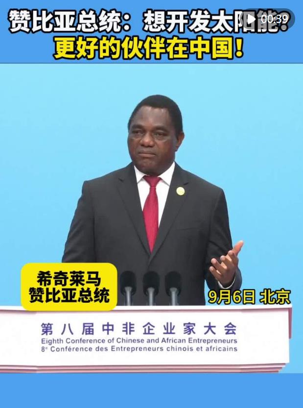 贊比亞總統(tǒng)希奇萊馬6日在第八屆中非企業(yè)家大會開幕式上稱贊中國技術(shù),呼吁非中企業(yè)加強技術(shù)合作。誰是更好的能源領(lǐng)域合作伙伴?誰能提供最好的太陽能發(fā)電技術(shù)?他告訴非洲企業(yè)家:“那就是你們的中國同行!”
