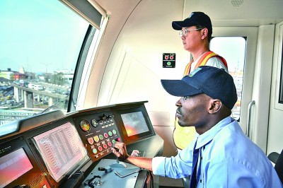 尼日利亞拉各斯,中國師傅指導當?shù)匾娏曀緳C駕駛中企承建的輕軌列車。新華社發(fā)