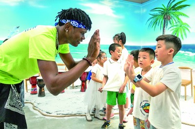 在位于湖南高橋大市場的中非經貿博覽會常設展館安哥拉館,志愿者和學生在研學過程中擊掌。新華社發(fā)