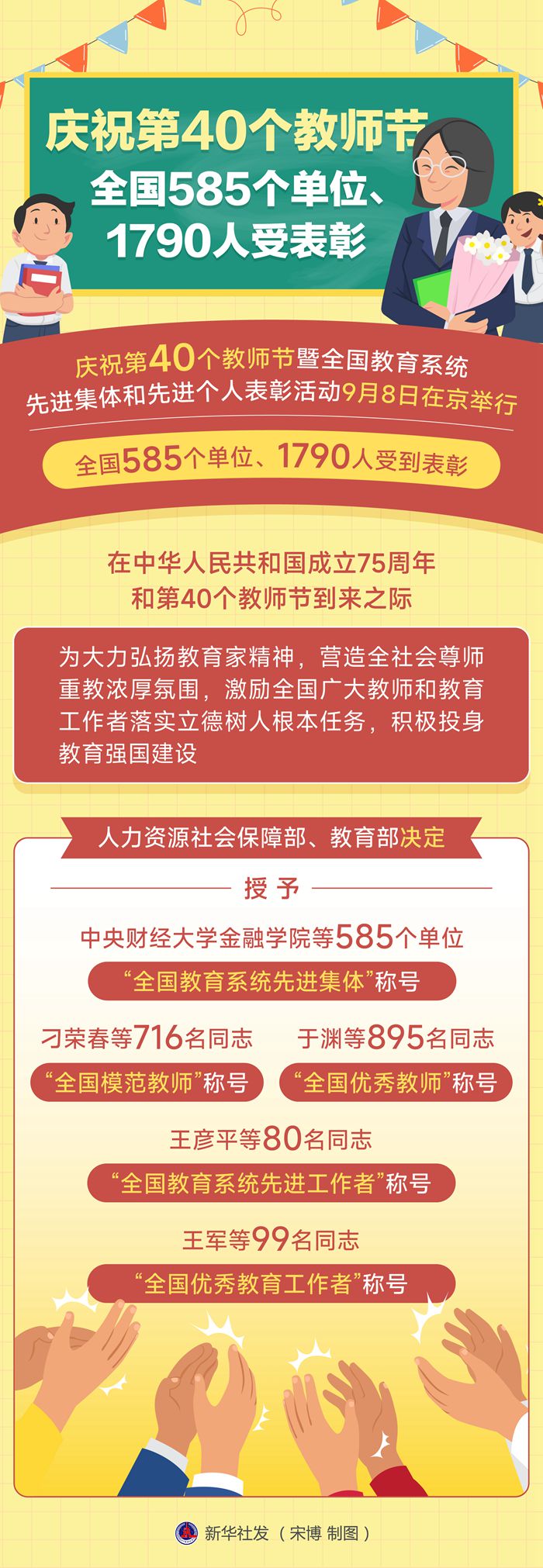 新華社北京9月8日電 慶祝第40個(gè)教師節(jié)暨全國教育系統(tǒng)先進(jìn)集體和先進(jìn)個(gè)人表彰活動(dòng)8日在京舉行。全國585個(gè)單位、1790人受到表彰。
