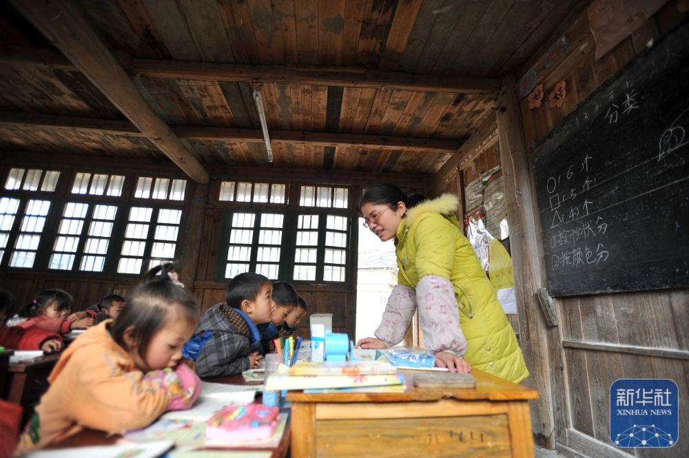 在廣西靈川縣蘭田瑤族鄉(xiāng)東良教學點,“85后”老師石夏月給學生上課(2022年2月24日攝)。