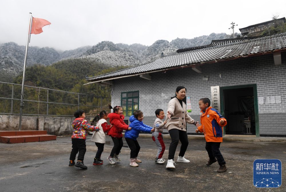 在廣西靈川縣蘭田瑤族鄉(xiāng)東良教學點,“85后”老師石夏月和學生做游戲(2022年2月24日攝)。
