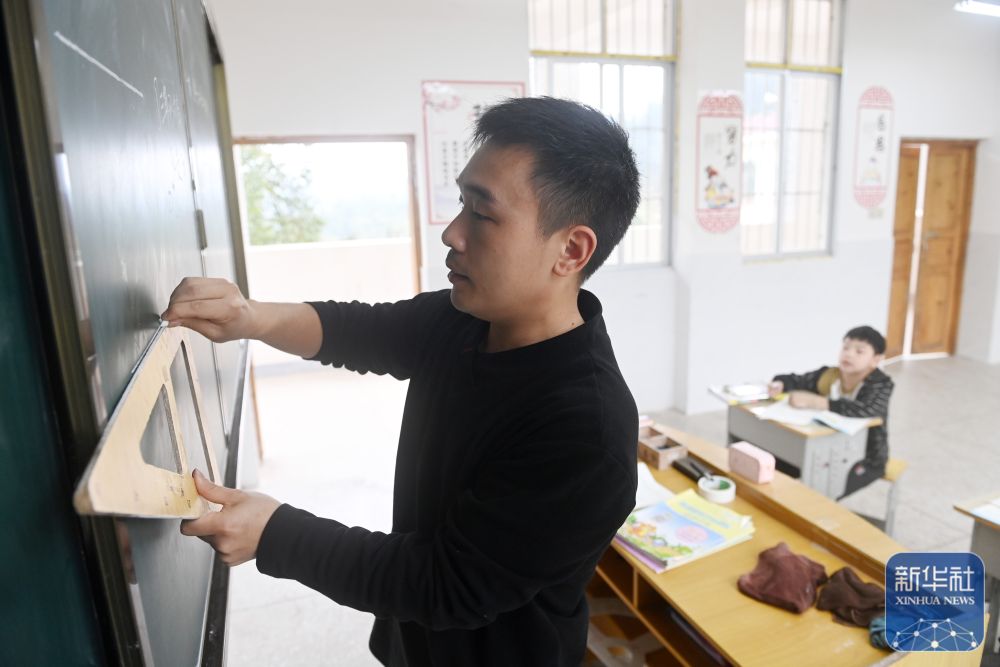 在廣西富川瑤族自治縣新華鄉(xiāng)湖廣小學,“90后”老師謝其鶴在輔導學生功課(2019年3月20日攝)。
