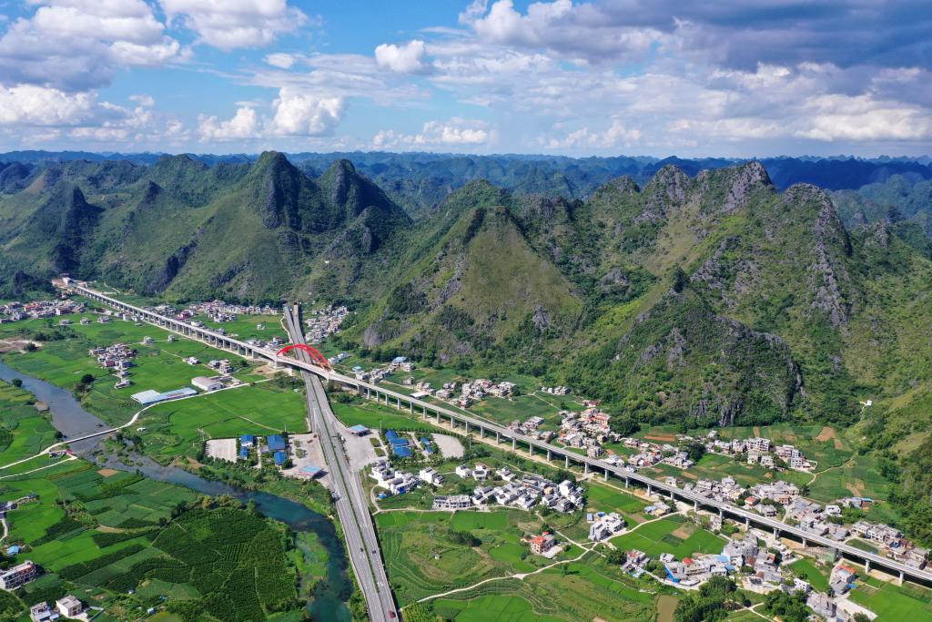 這是廣西都安瑤族自治縣境內(nèi)的交通路網(wǎng)(2021年8月31日攝,無人機(jī)照片)。新華社記者 陸波岸 攝