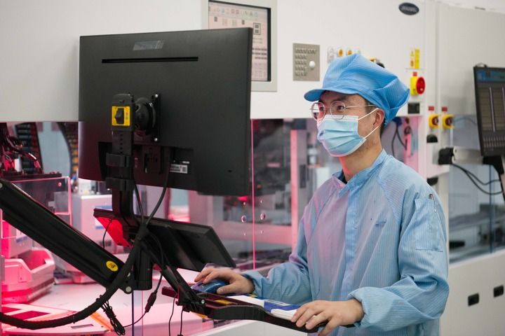 8月20日,在安徽華晟新能源科技股份有限公司的異質結光伏電池及組件工廠內,工作人員在查看智能化產線運行情況。