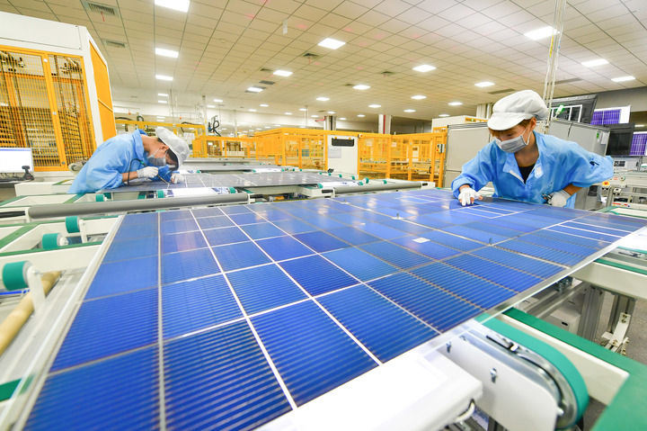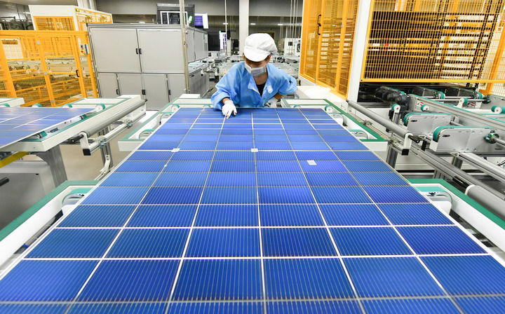 8月20日,工作人員在安徽華晟新能源科技股份有限公司的異質結光伏電池及組件工廠內作業(yè)。