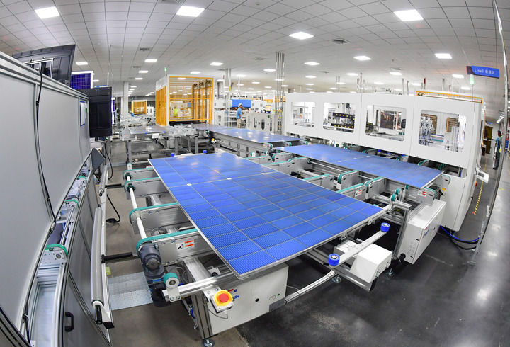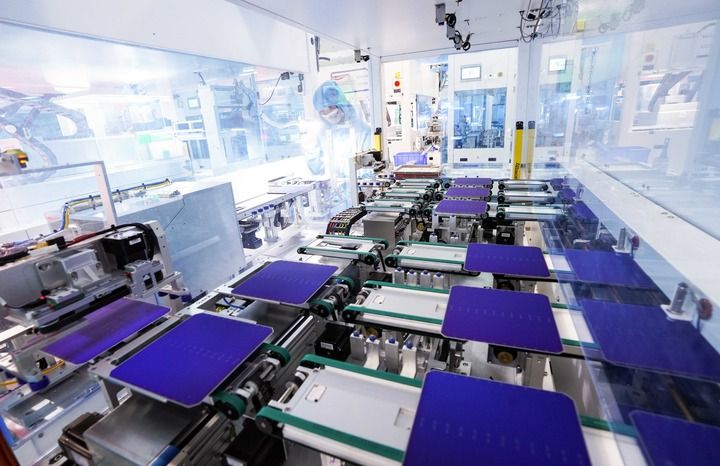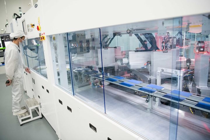 安徽合肥,全球單體產能最大的異質結光伏電池及組件一體化工廠,工業(yè)機器人將一個個硅片投送到一架白色機器的腔體,經(jīng)過綿延的智能化流水線,狀如手機大小、薄如紙片的光伏電池片便下線了。