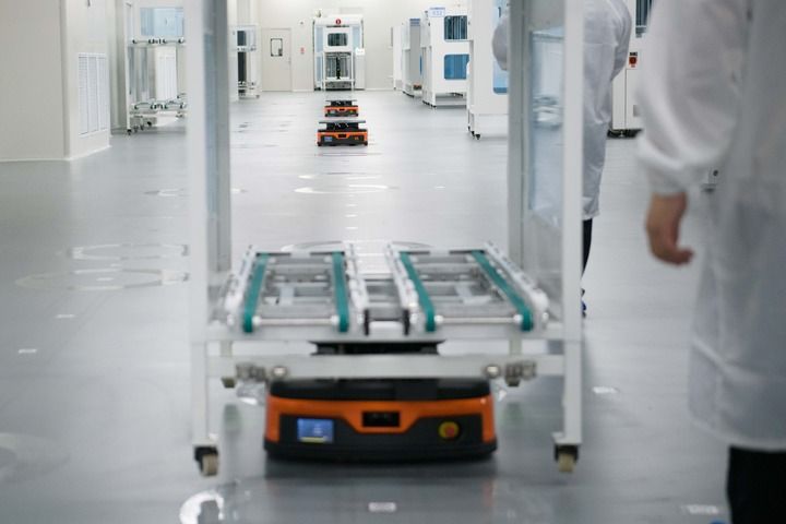 8月20日,在安徽華晟新能源科技股份有限公司的異質結光伏電池及組件工廠內,搬運機器人在作業(yè)。