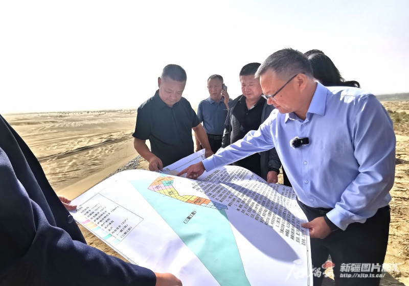 9月5日,民豐縣領(lǐng)導在治沙現(xiàn)場為記者介紹后河壩防沙治沙規(guī)劃。石榴云/新疆日報記者 曹華攝