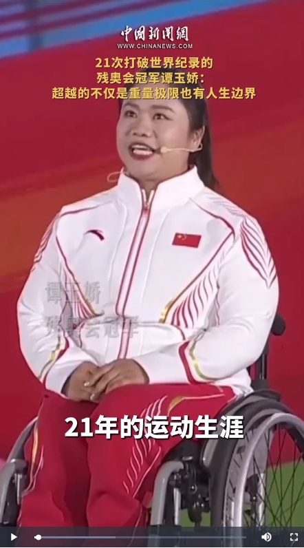 1990年出生的譚玉嬌7歲時因骨髓炎導(dǎo)致右腿殘疾。如今,她拿到了43枚金牌,21次打破世界紀(jì)錄。一次次超越重量極限的她,也在超越著她人生的邊界。譚玉嬌成為中國首位國際殘奧委會運(yùn)動員委員會委員,在巴黎殘奧會閉幕式上留下了屬于中國的獨(dú)特印跡。