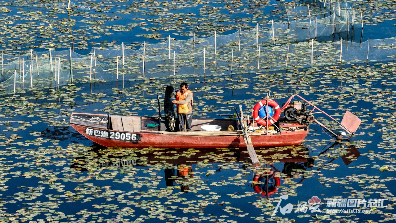 9月20日,養(yǎng)殖戶在博斯騰湖上捕撈螃蟹(無人機(jī)攝)。石榴云/新疆日?qǐng)?bào)記者 周鵬攝