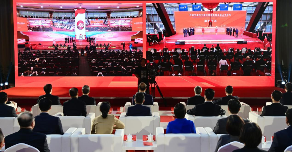 2023年4月10日,在滬深交易所主板注冊(cè)制首批企業(yè)上市儀式北京分會(huì)場(chǎng),與會(huì)嘉賓通過(guò)屏幕實(shí)時(shí)觀(guān)看滬深兩地交易所上市儀式。新華社記者李賀 攝