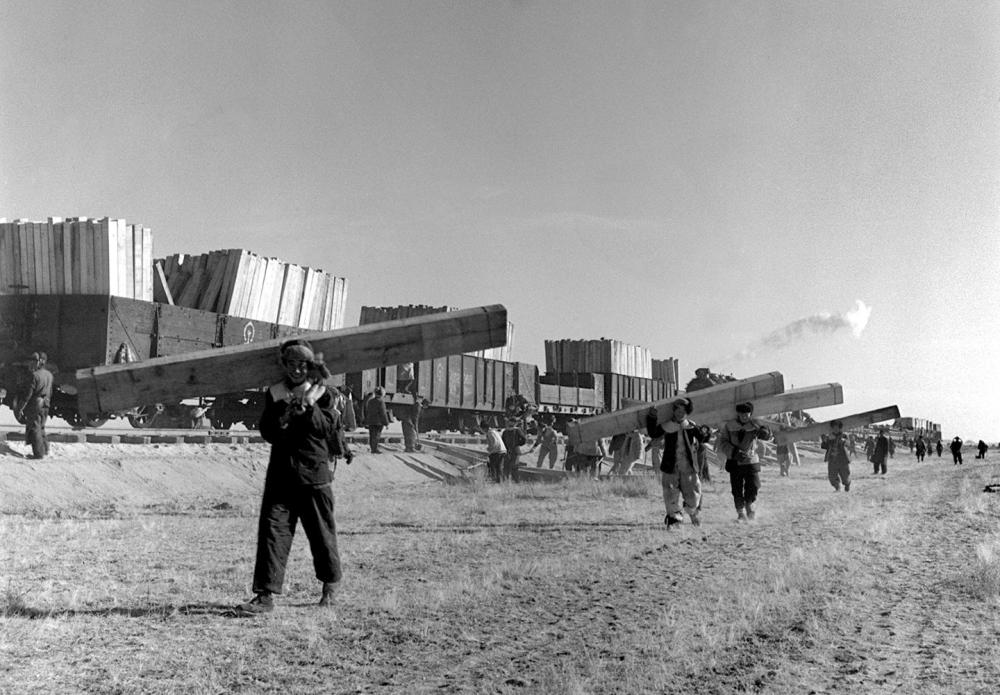 在內(nèi)蒙古集二線鐵路建設(shè)中,工人扛著枕木,前往鋪軌地點(diǎn)。集二線鐵路1953年5月開(kāi)工建設(shè)。新華社記者 鄒健東 攝
