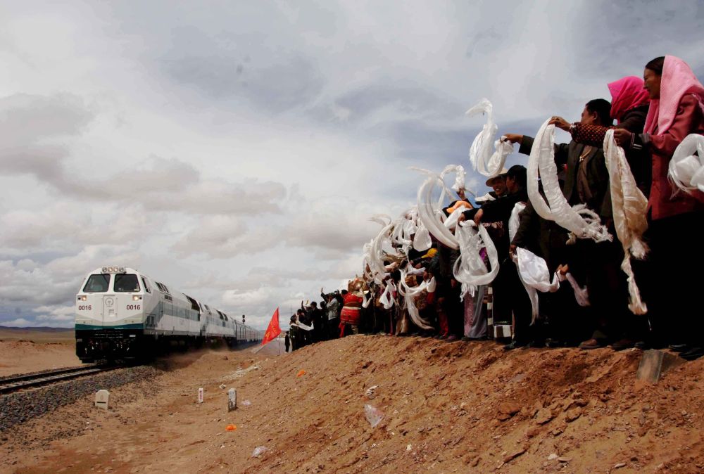 2006年7月1日,青藏鐵路全線通車。在青海沱沱河大橋橋頭,當(dāng)?shù)厝罕姎g迎從格爾木出發(fā)的“青1”次列車。新華社記者 陳?ài)?攝