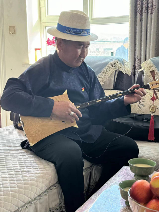 甫·巴特孟克向采訪團展示才藝,他住的安居房在2017年精河縣6.6級地震中安然無恙。新華網(wǎng)發(fā)