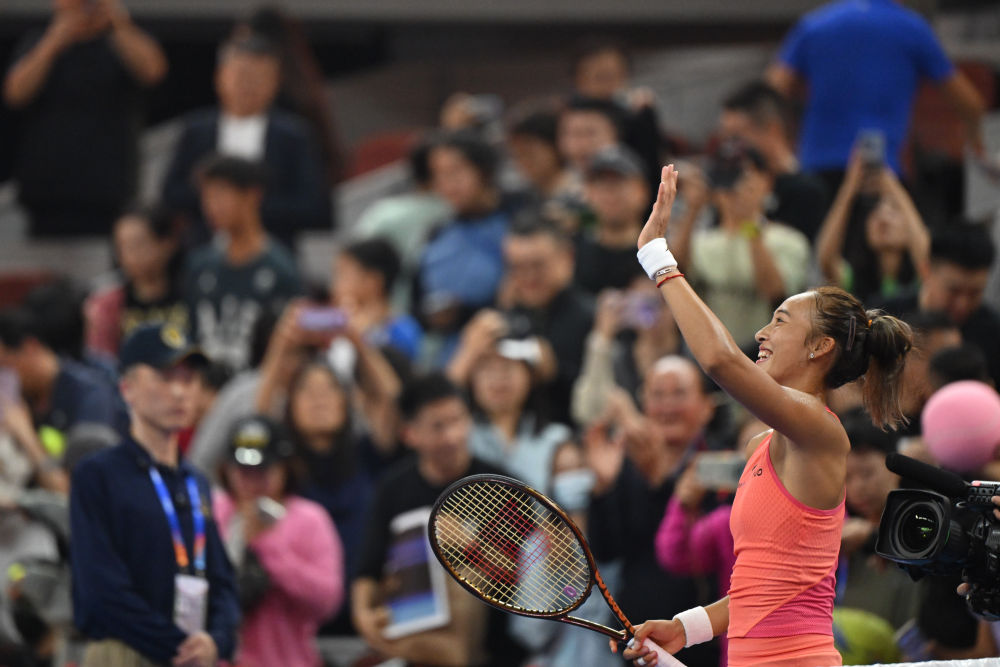 9月28日,鄭欽文在賽后向觀眾致意。當(dāng)日,在北京進(jìn)行的2024中國網(wǎng)球公開賽女單第二輪比賽中,中國選手鄭欽文2:0戰(zhàn)勝俄羅斯選手拉希莫娃,晉級下一輪。新華社記者 張龍 攝