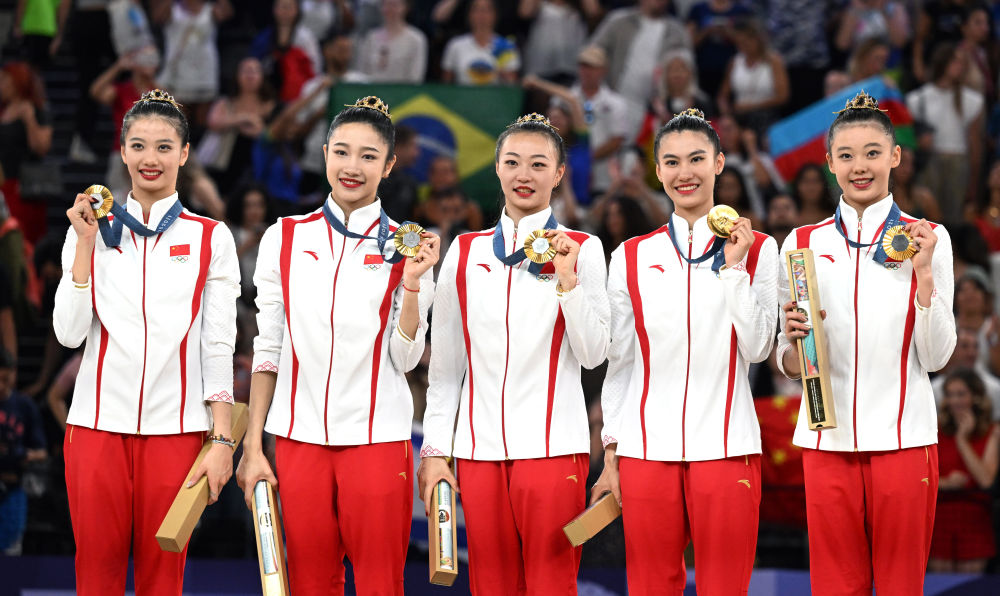 8月10日,中國隊(duì)在頒獎(jiǎng)儀式上。當(dāng)日,在巴黎奧運(yùn)會藝術(shù)體操項(xiàng)目集體全能決賽中,中國隊(duì)獲得冠軍。新華社記者 程敏 攝