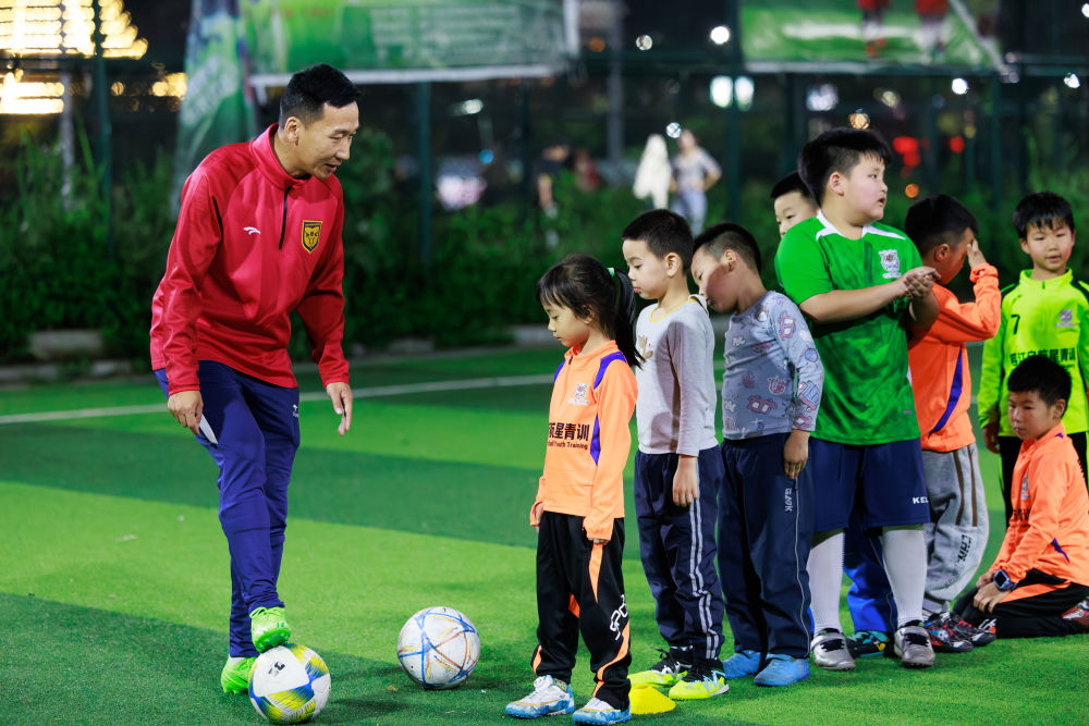 4月8日,董永恒(左一)在對榕江縣的小球員進(jìn)行培訓(xùn)。新華社記者 劉續(xù) 攝