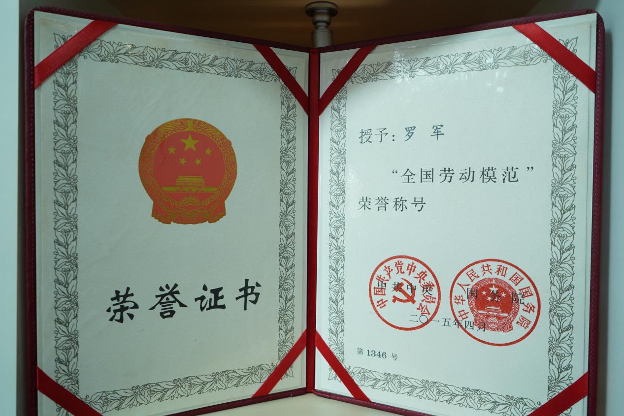 圖為羅軍被授予“全國(guó)勞動(dòng)模范”榮譽(yù)稱(chēng)號(hào)的證書(shū)。