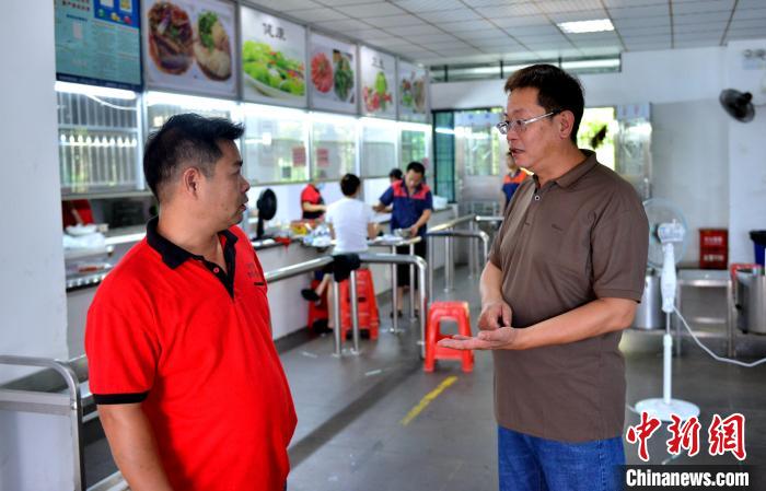 臺(tái)胞莊書賢(右)與企業(yè)食堂員工交流。中新社記者 呂明 攝