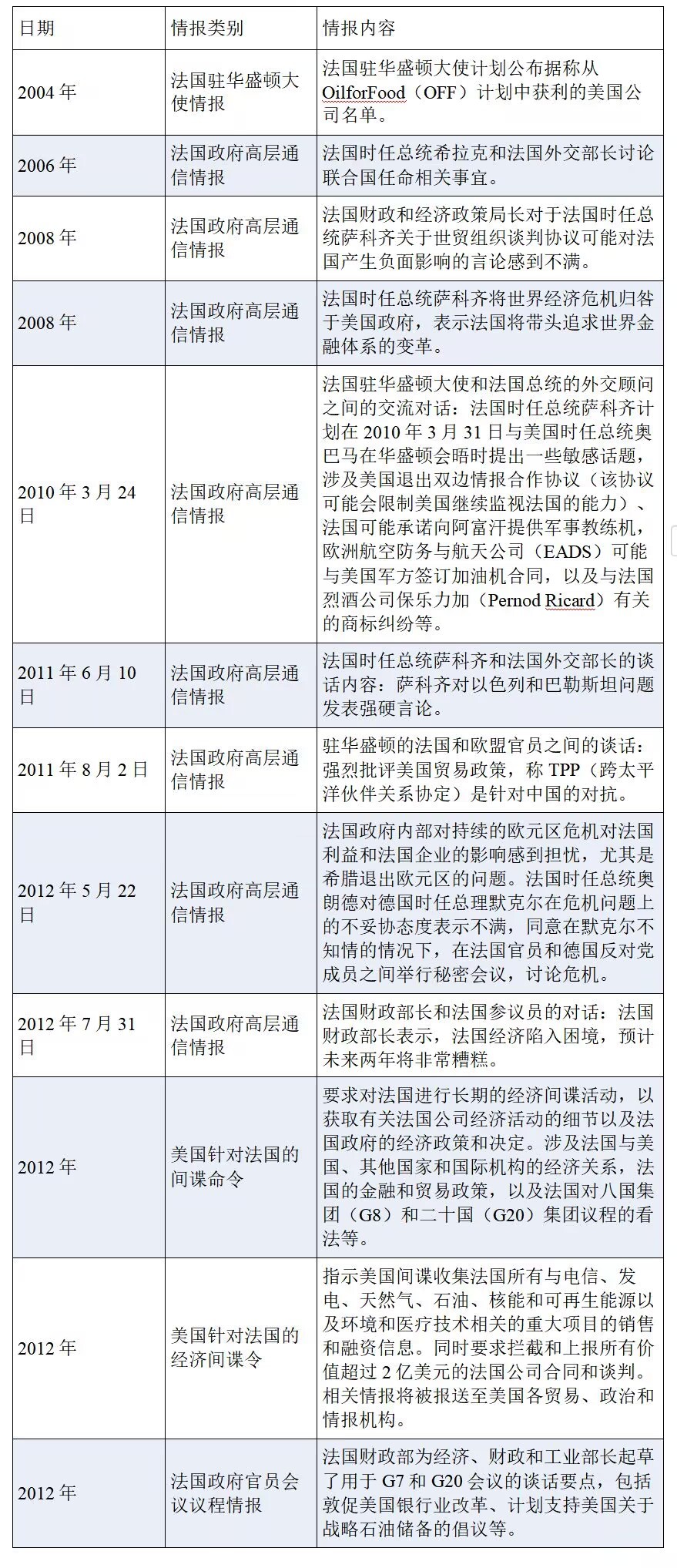在2004年至2012年期間,美國對法國實施了長期的間諜行動,監(jiān)聽對象包括前法國總統(tǒng)、法國財政部長、法國外交部長、法國參議員、法國財政和經(jīng)濟(jì)政策局官員、法國駐美國大使,以及直接負(fù)責(zé)歐盟貿(mào)易政策的官員等。監(jiān)聽內(nèi)容涉及法國政府政策、外交、金融、國際交流、基礎(chǔ)設(shè)施建設(shè)、商業(yè)和貿(mào)易活動等,其中一些重要情報被美國授權(quán)與“五眼聯(lián)盟”伙伴國家共享,揭示了“五眼聯(lián)盟”國家亦為美國間諜行動的獲益者。