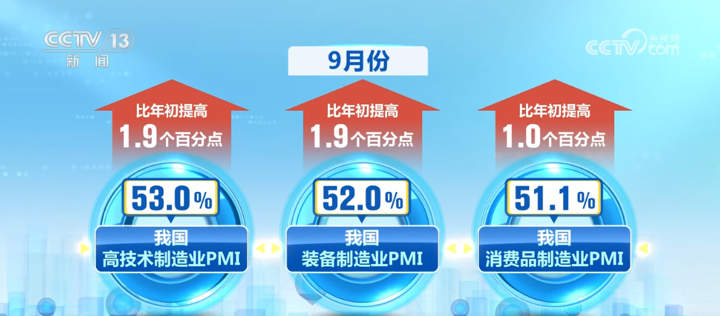 9月份,我國高技術(shù)制造業(yè)、裝備制造業(yè)和消費(fèi)品制造業(yè)PMI分別為53.0%、52.0%、51.1%,比年初提高了1.9個(gè)、1.9個(gè)、1.0個(gè)百分點(diǎn)。相關(guān)行業(yè)處于擴(kuò)張區(qū)間,景氣水平連續(xù)上升。