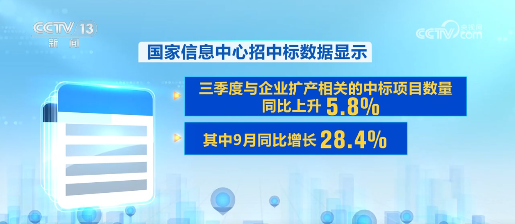 不僅工程建設(shè)在提速,作為項(xiàng)目落地的第一步,中標(biāo)數(shù)據(jù)也在快速增長。國家信息中心招中標(biāo)數(shù)據(jù)顯示,三季度與企業(yè)擴(kuò)產(chǎn)相關(guān)的中標(biāo)項(xiàng)目數(shù)量同比上升5.8%,其中9月同比增長28.4%,為今年以來最高增速,企業(yè)擴(kuò)產(chǎn)熱度回升明顯。