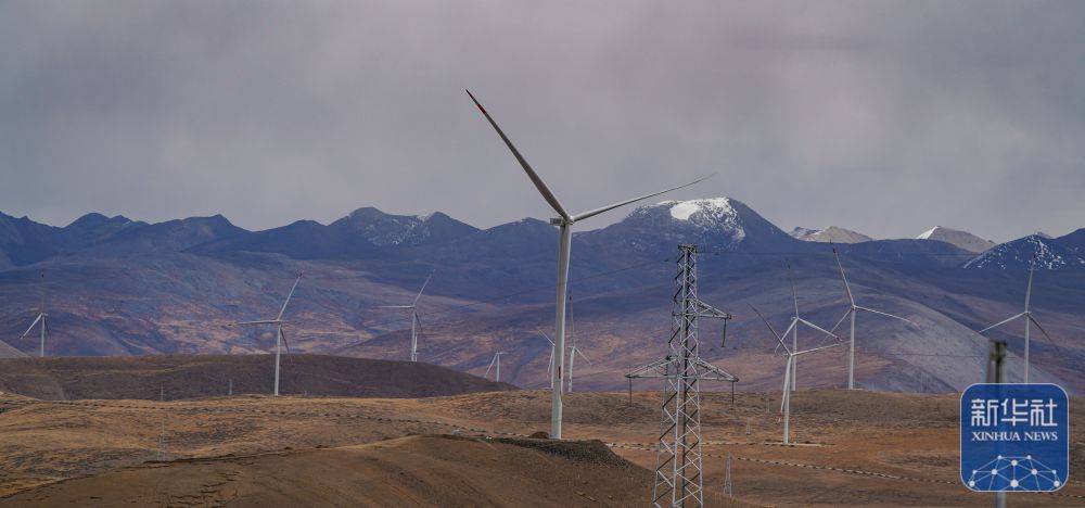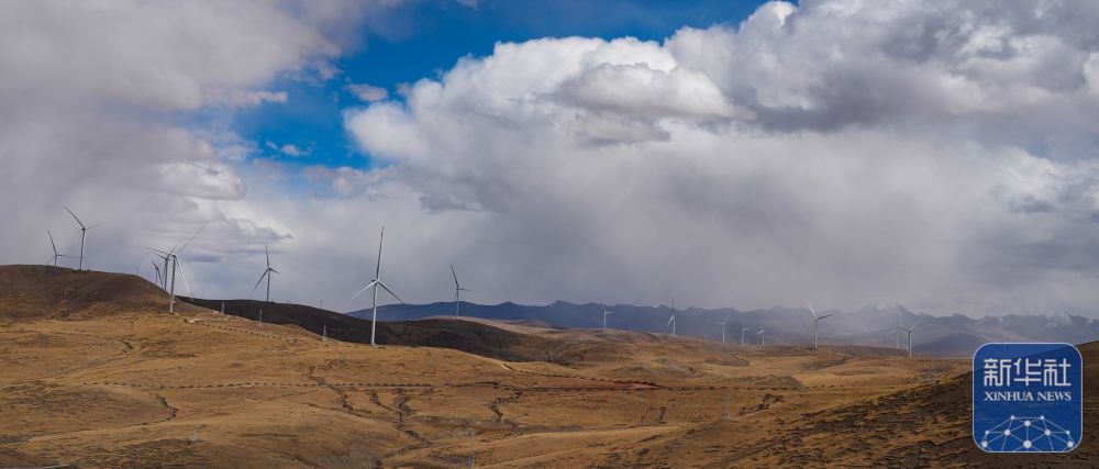 10月17日拍攝的位于西藏日喀則市薩迦縣的風(fēng)力發(fā)電機(jī)組。