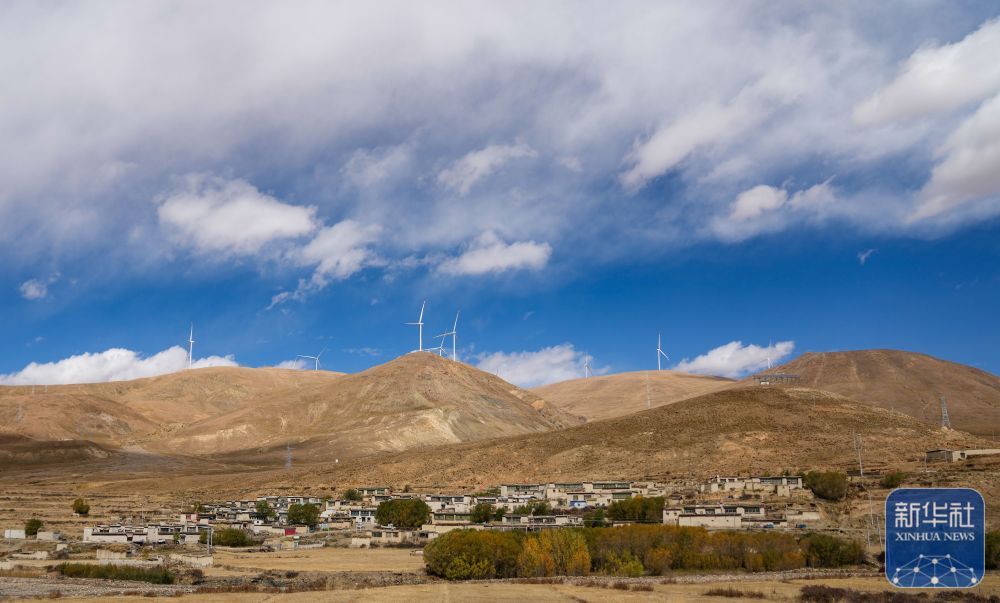 10月17日拍攝的位于西藏日喀則市薩迦縣的風(fēng)力發(fā)電機(jī)組及山腳下的村莊。