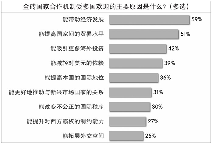 在12國受訪者看來,金磚機(jī)制受多國歡迎的最主要原因是它“能帶動(dòng)經(jīng)濟(jì)發(fā)展”,有近六成受訪者認(rèn)同此原因。過半受訪者認(rèn)為,“能提高國家間的貿(mào)易水平”是金磚機(jī)制受歡迎的原因。此外,能“吸引更多海外投資”“減輕對美元的依賴”“提高本國國際地位”等原因也獲得較多認(rèn)同。王友明對《環(huán)球時(shí)報(bào)》記者分析說:“開放、包容、合作、共贏的精神是金磚國家能夠走向‘大金磚’的根本原因,這四個(gè)要素缺一不可?!?/p>