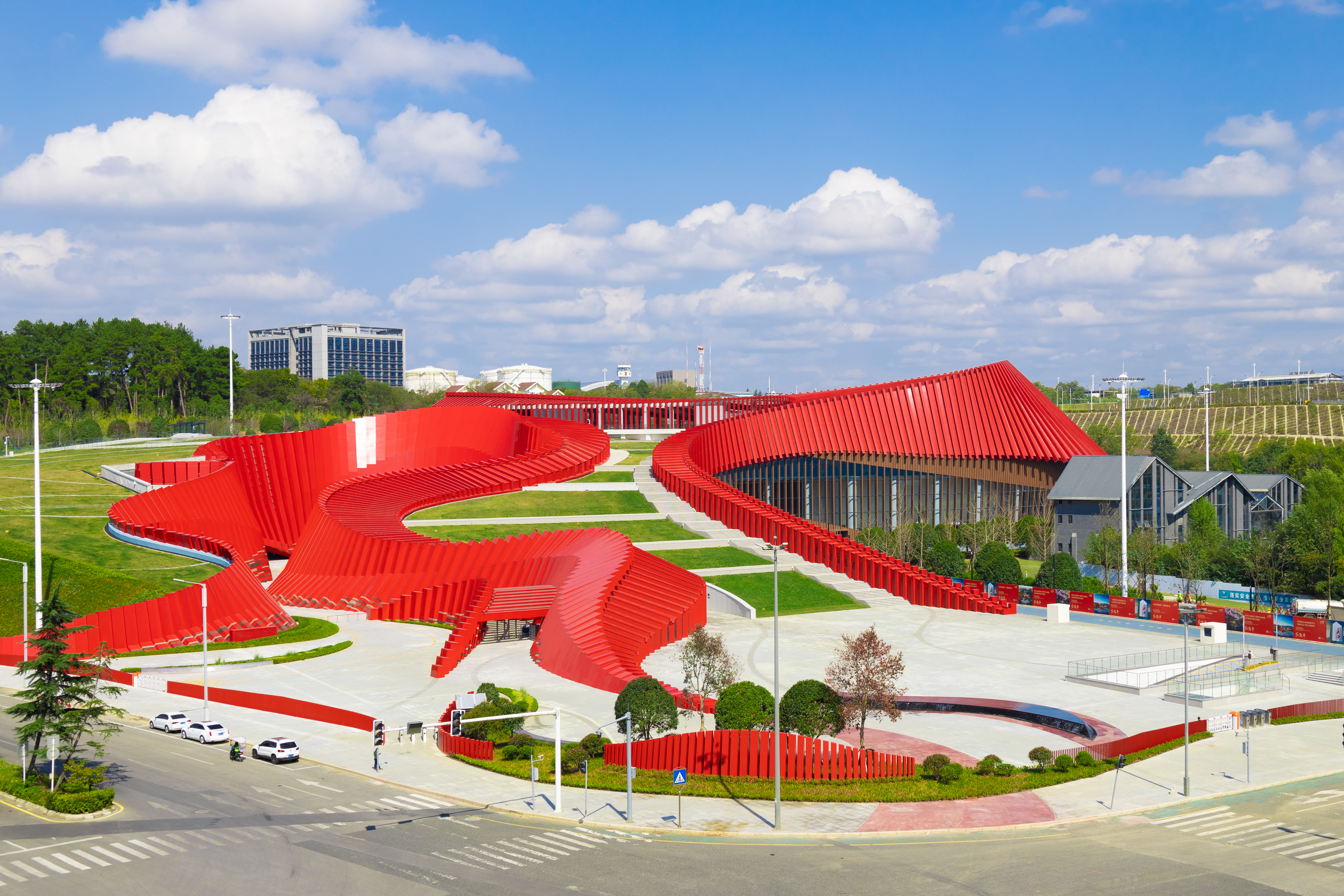 乘坐航班前往貴陽的游客,若在貴陽龍洞堡機(jī)場(chǎng)上空俯瞰,可發(fā)現(xiàn)有一座巨型建筑鋪展在青山綠水之間。它由一塊塊紅色的曲面幕墻構(gòu)成,此起彼伏,形成了連續(xù)轉(zhuǎn)折的動(dòng)態(tài)輪廓,猶如一條靈動(dòng)的“紅飄帶”。它就是全國(guó)首個(gè)以長(zhǎng)征為主題的全域沉浸式數(shù)字科技體驗(yàn)館,也是長(zhǎng)征國(guó)家文化公園貴州重點(diǎn)建設(shè)區(qū)的標(biāo)志性、引領(lǐng)性工程。
