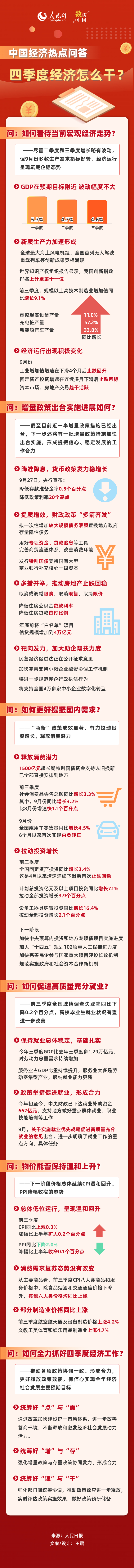 10月18日,前三季度中國(guó)經(jīng)濟(jì)數(shù)據(jù)公布:GDP同比增長(zhǎng)4.8%,經(jīng)濟(jì)運(yùn)行總體平穩(wěn)、穩(wěn)中有進(jìn)。與此同時(shí),部分指標(biāo)增速有所波動(dòng),經(jīng)濟(jì)運(yùn)行出現(xiàn)一些新的情況和問題。如何看待當(dāng)前經(jīng)濟(jì)走勢(shì)?四季度經(jīng)濟(jì)怎么干?針對(duì)經(jīng)濟(jì)熱點(diǎn)問題,相關(guān)人士作出分析解答。人民網(wǎng)以相關(guān)報(bào)道提供的數(shù)據(jù)為基礎(chǔ)推出“數(shù)讀中國(guó)”圖解。