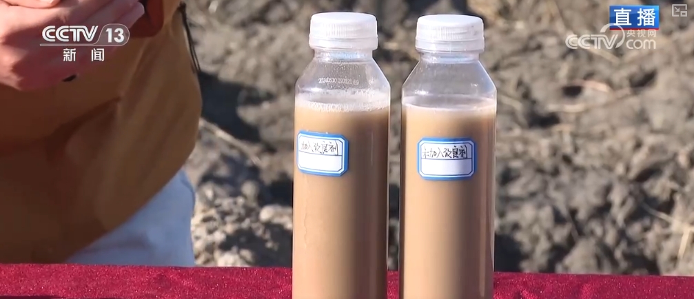 這片田采用的是有機硅改良劑來治理的鹽堿地,選取同地塊的鹽堿土溶于水中,加入有機硅后,土壤和水快速分層??梢钥吹?,有機硅具有較強的親土性,可以和土壤包裹一起,阻斷鹽分吸收,從而達到降堿和改變土壤板結(jié)的作用。這能讓水稻更好地扎根生長,渾濁的水變清澈,也可以增加作物的光合作用,有效治理重度鹽堿土壤。